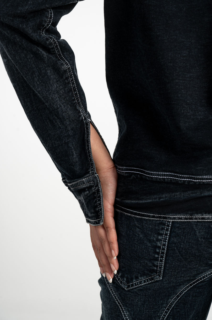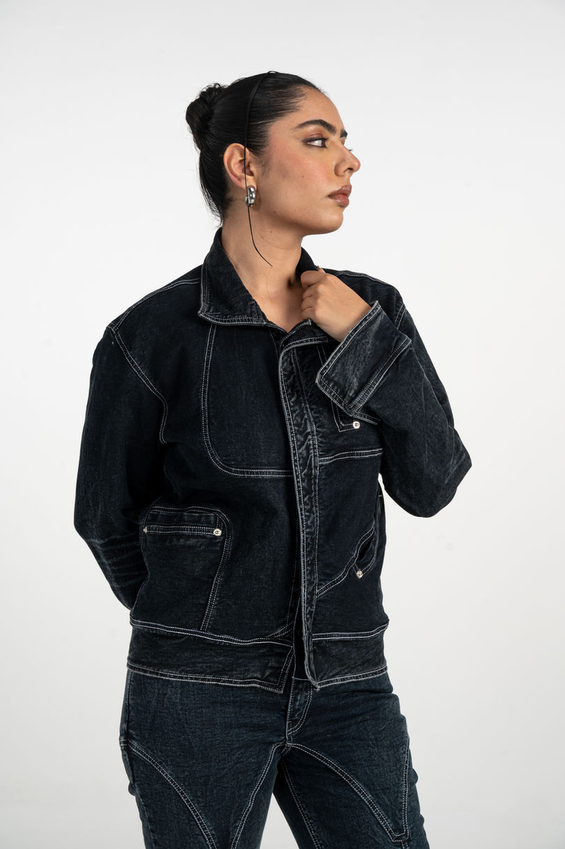 A grungy denim jacket with logo detailing and three front pockets. Whiskered sleeves and a rugged wash make it an edgy essential.