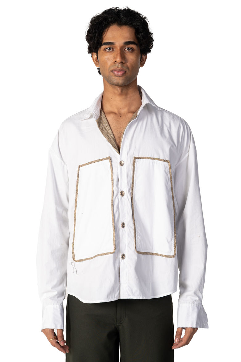 The Invert Shirt is fully reversible—featuring crisp white poplin on one side, and raw beige cotton with unfinished hems, pockets, and collar on the other. A piece that plays with contrast: polished vs. imperfect, structure vs. process. Designed to be flipped, styled, and seen from more than one perspective.