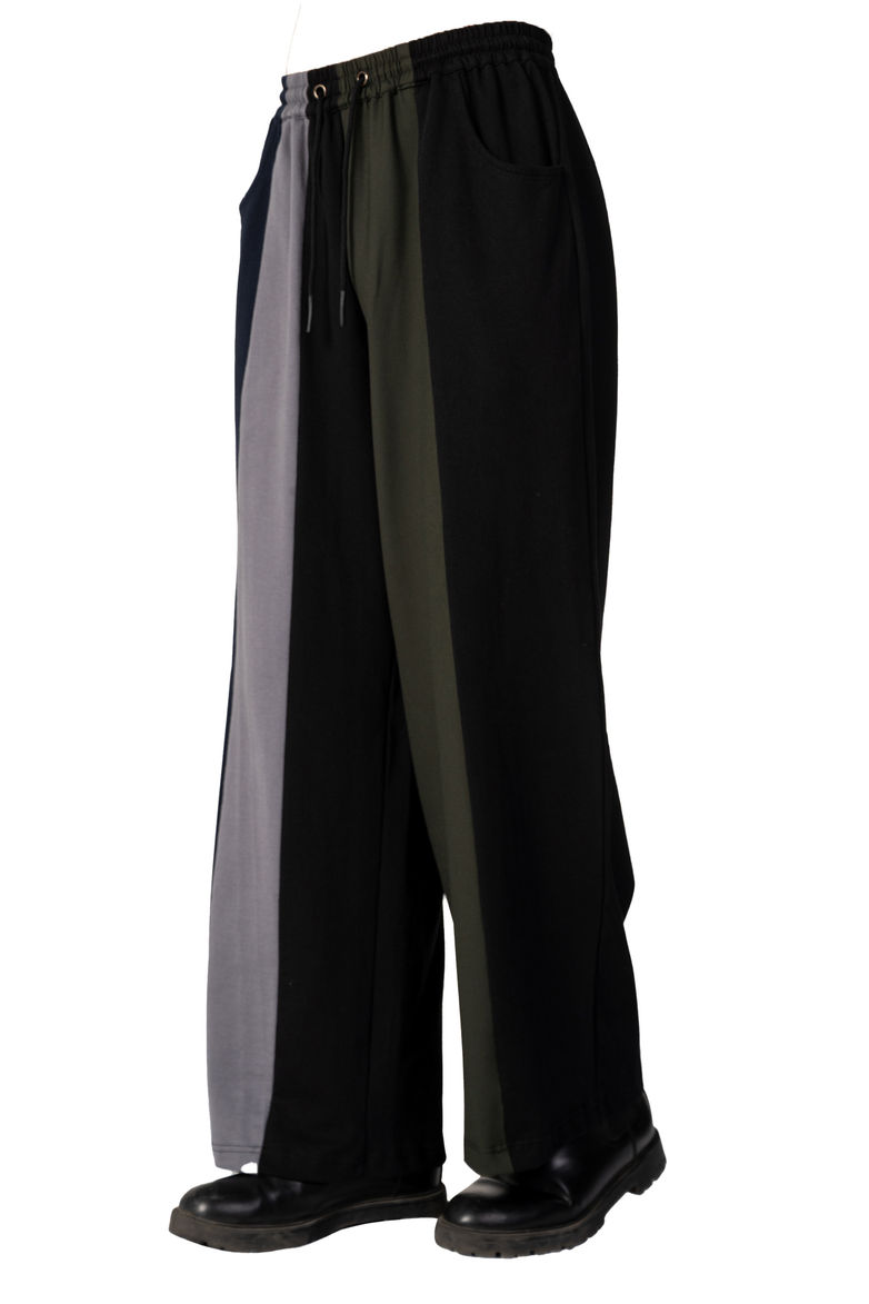 The Median Tracks feature tonal panels of navy, grey, olive, and black running vertically like the painted medians that guide city movement but often go unseen. Wide-legged with a relaxed silhouette, these pants reflect the collection’s core idea: finding rhythm and beauty in the overlooked. Made for everyday ease, designed to interrupt the ordinary.