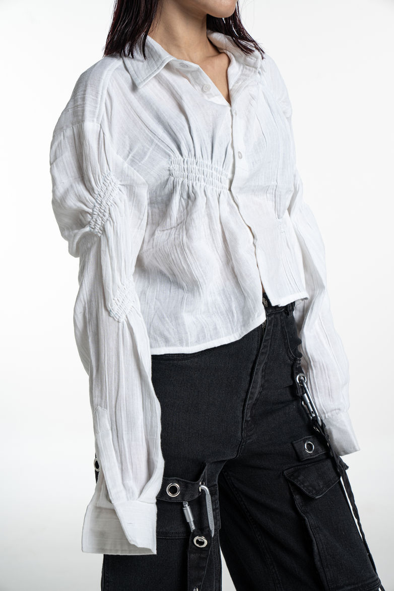 A daring fusion of tradition and experimentation. Crafted from wrinkled fabric, it features sinched elastic details that create an intentionally asymmetrical design. With the button placket deliberately off-kilter, this shirt redefines conventional style, offering a bold statement for the fashion-forward individual.