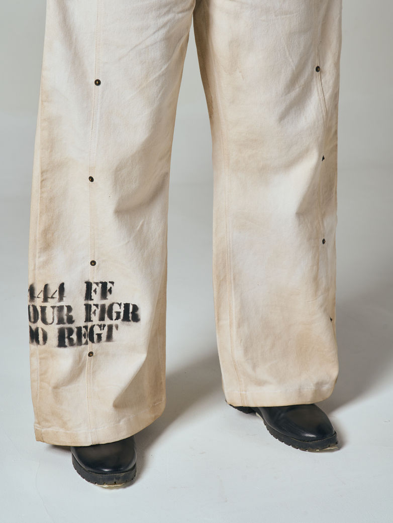 Inspired by army trunks used during transfers, they feature sprayed-on regiment names and numbers across the fabric — raw, authentic, and bold. A centre panel construction adds structure, while scattered rivets elevate the design with a utilitarian touch.