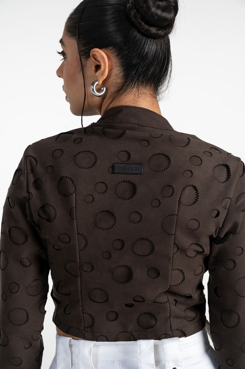 A structured top with laser-cut gears, a unique neckline, and a flattering fit. Ideal for making a bold yet sophisticated statement