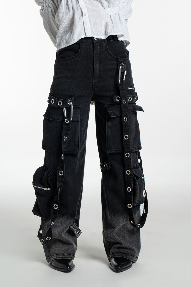 The ultimate blend of functionality and style. Featuring a plethora of pockets and a striking ombre wash, these cargos are as practical as they are fashionable. With eyelets scattered throughout and adjustable hanging parts, they offer a unique touch and endless styling possibilities. Plus, their perfect fit ensures both comfort and confidence with every wear.