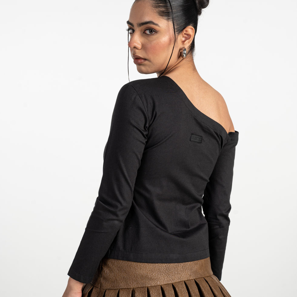 A body-hugging top with unique asymmetrical button detailing, showcasing various button styles for a truly distinct look.