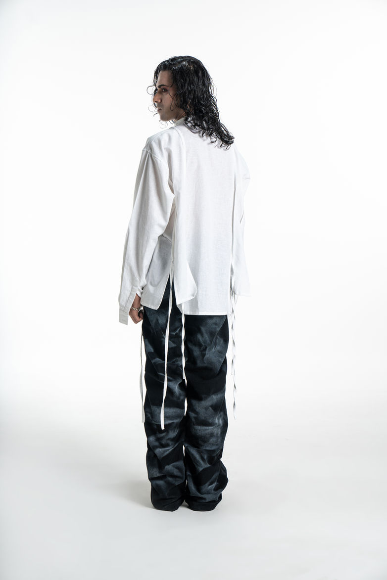 A bold departure from tradition. With its asymmetrical hem and kimono-like silhouette, this garment is constructed in eight parts, offering a distinctive look. Explore endless styling options with different drawstring configurations, turning each wear into a personalized statement of creativity and individuality.